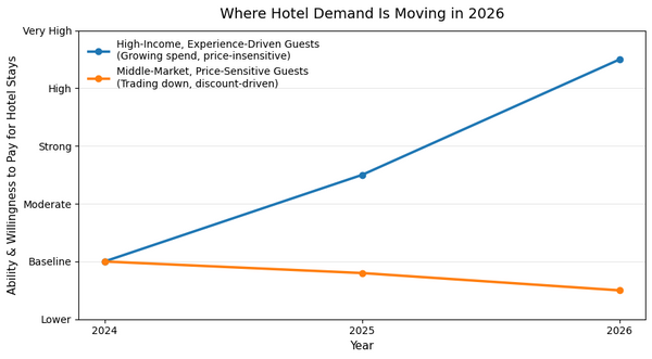 Hotel demand is splitting. High-market guests are spending more on fewer, better stays, while the middle market is pulling back and shopping on mainly price. Revenue Growth is concentrating at the top.